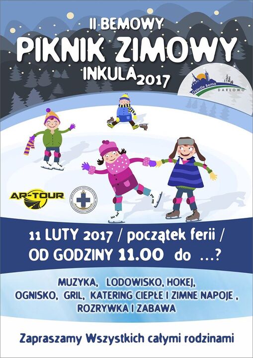 Osiedle Bema Darłowo, na dobry początek ferii zaprasza mieszkańców i wszystkich zainteresowanych na teren rekreacyjny nazywany INKULĄ, który znajduje się w granicach Osiedla Bema - DARŁOWO, koniec ul. E. Plater/Andersa, gdzie już w najbliższy weekend - dokładnie 11 lutego 2017 roku (tj. sobota) odbędzie się piknik zimowy.