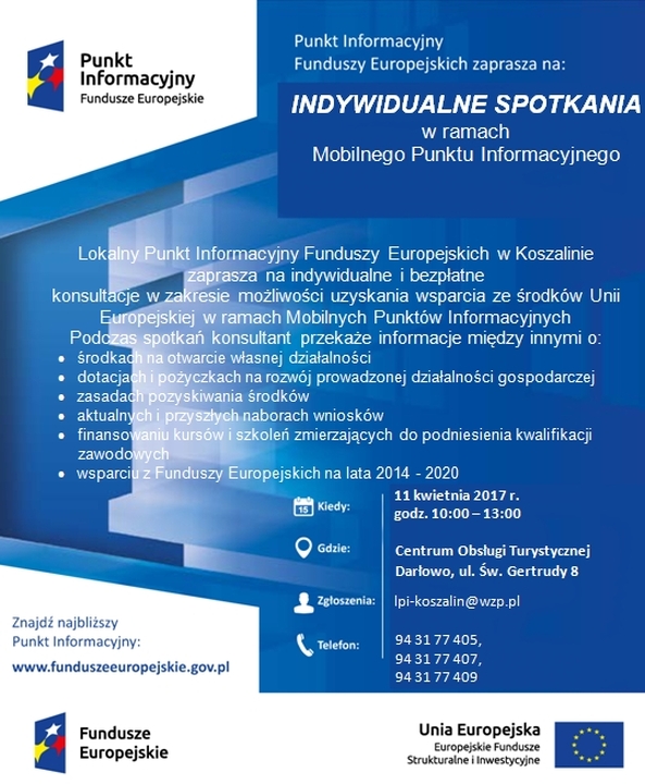 Lokalny Punkt Informacyjny w Koszalinie zaprasza na indywidualne i bezpłatne konsultacje w zakresie możliwości uzyskania wsparcia ze środków Unii Europejskiej w ramach Mobilnych Punktów Informacyjnych