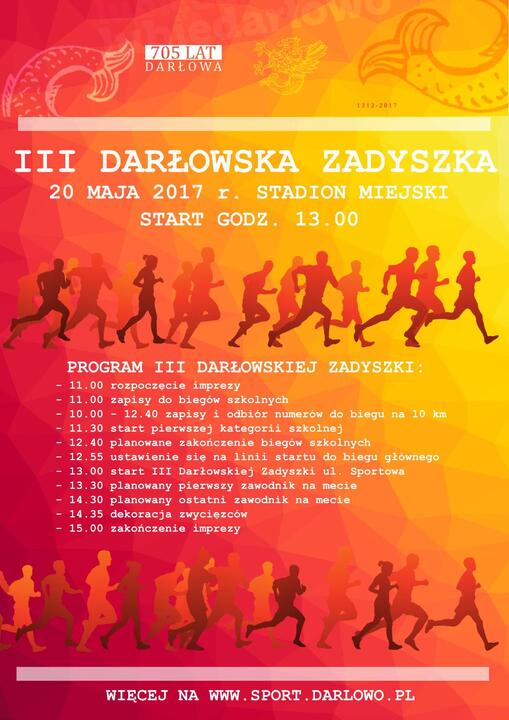 Już w sobotę, 20 maja Miasto Darłowo zaprasza, po raz trzeci, na bieg uliczny na dystansie 10 km ulicami Darłowa i jego nadmorskiej, plażowej dzielnicy - Darłówka. Tym razem Darłowska ZaDyszka odbędzie się w sobotę, jako jeden z filarów obchodów 705 Urodzin miasta Króla Eryka - podczas Dni Darłowa 2017.