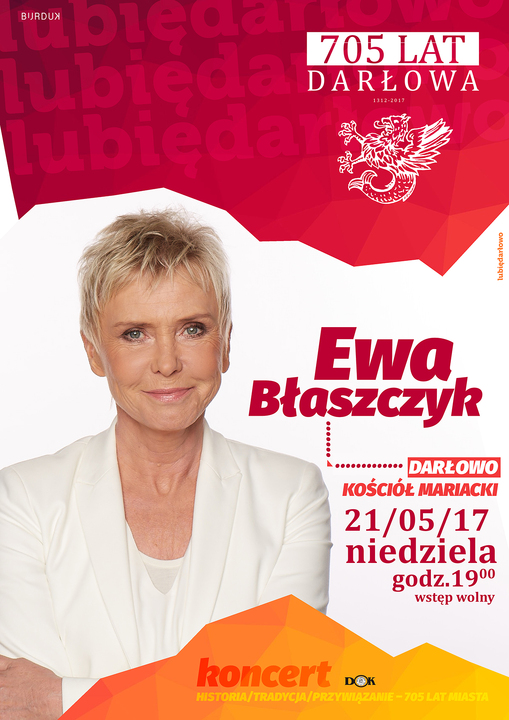 Dokładnie za tydzień, w niedzielę 21 maja 2017 w ramach obchodów Dni Darłowa 2017 w Kościele Mariackim odbędzie się koncert Ewy Błaszczyk. Wstęp na to wydarzenie jest bezpłatny. Zapraszamy: Kościół Mariacki, początek godz. 19:00.