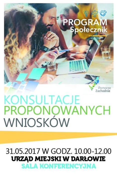 Dnia 31 maja br. w godzinach 10.00-12.00 w sali konferencyjnej Urzędu Miejskiego w Darłowie, odbędą się konsultacje dotyczące Programu Społecznik. Każdy przedstawiciel organizacji pozarządowej/grupy nieformalnej będzie miał możliwość skonsultowania swojego wniosku projektowego.