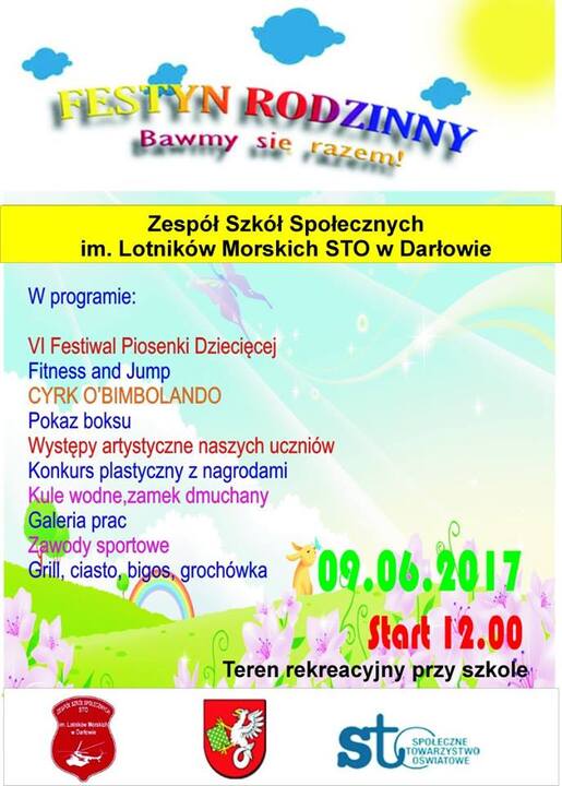 Zespół Szkół Społecznych im. Lotników Morskich STO w Darłowie zaprasza do udziału w Festynie Rodzinnym pn.: „Bawmy się razem" w programie:
