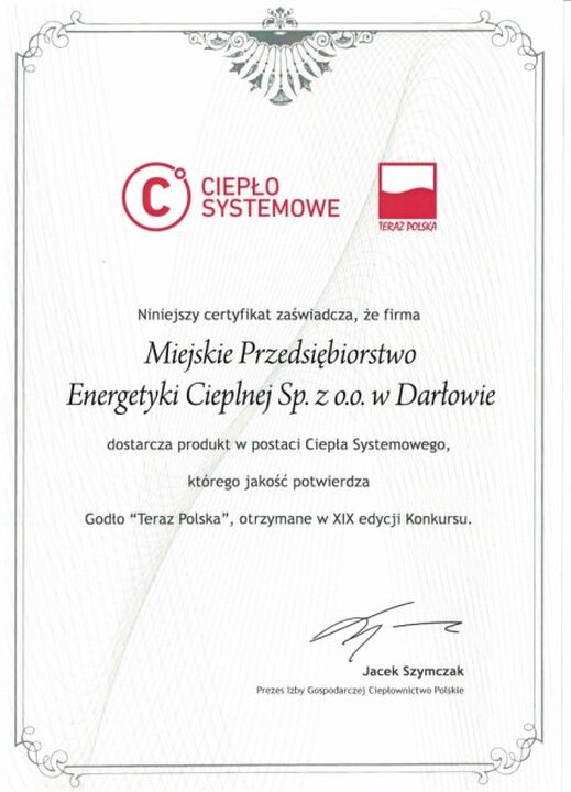 Jak nas poinformowała Barbara Butyńska-Balcerzak dyrektorka Miejskiego Przedsiębiorstwa Energetyki Cieplnej w Darłowie firma ta została uhonorowana godłem „Teraz Polska” w 19 edycji tego ogólnopolskiego prestiżowego konkursu.
