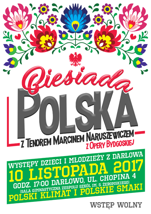 Świętujmy razem. Zapraszamy - 10 listopada 2017, godz. 17:00, sala gimnastyczna przy Zespole Szkół im. S. Żeromskiego w Darłowie. Wstęp wolny.