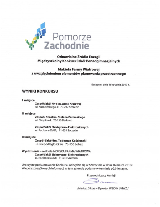 Jakiś czas temu informowaliśmy, że uczniowie Zespołu Szkół im. Stefana Żeromskiego w Darłowie - dokładnie uczniowie klasy II Technikum urządzeń i systemów energetyki odnawialnej przygotowali pracę konkursową - zminiaturyzowaną farmę wiatrową i złożyli ją na konkurs, którego organizatorem był Marszałek Województwa Zachodniopomorskiego - Olgierd Geblewicz. Miło nam poinformować, że farma wiatrowa z Darłowa, którą przygotowała młodzież z Darłowa pod okiem dra M. Barana z Politechniki Koszalińskiej - zdobyła II miejsce w województwie. Uroczyste podsumowanie projektu odbędzie się 16 marca 2018 roku w Szczecinie.