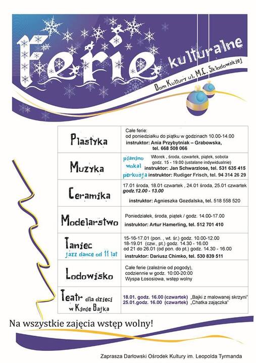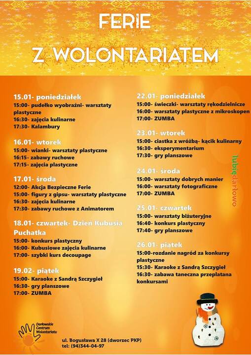 Jeszcze nigdy Miasto Darłowo nie przygotowało tak bogatego wachlarza  zajęć dla dzieci i młodzieży w czasie ferii zimowych. Analiza oferty pokazuje, że miejskie instytucje i stowarzyszenia proponują młodym mieszkańcom miasta kilkanaście godzin dziennie zajęć sportowych oraz kilkanaście godzin zajęć plastycznych, tanecznych, muzycznych, kulinarnych, itd. Do tego doliczmy projekcje filmów, przedstawienia teatralne i godziny rekreacji na miejskim lodowisku.