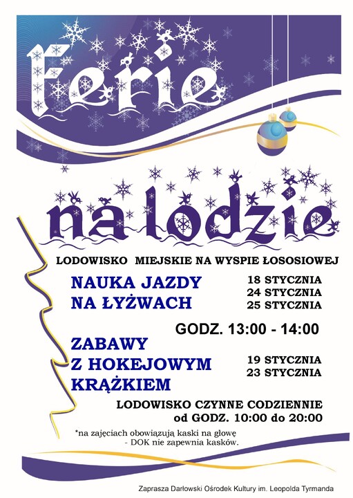 Ponadto Darłowski Ośrodek Kultury zaprasza na naukę jazdy na łyżwach w terminach: 18 stycznia (czwartek), 24 stycznia (środa) i 25 stycznia (czwartek). Godziny: 13:00-14:00. Zabawy z hokejowym krążkiem odbędą się: 19 i 23 stycznia (w tych samych godzinach)