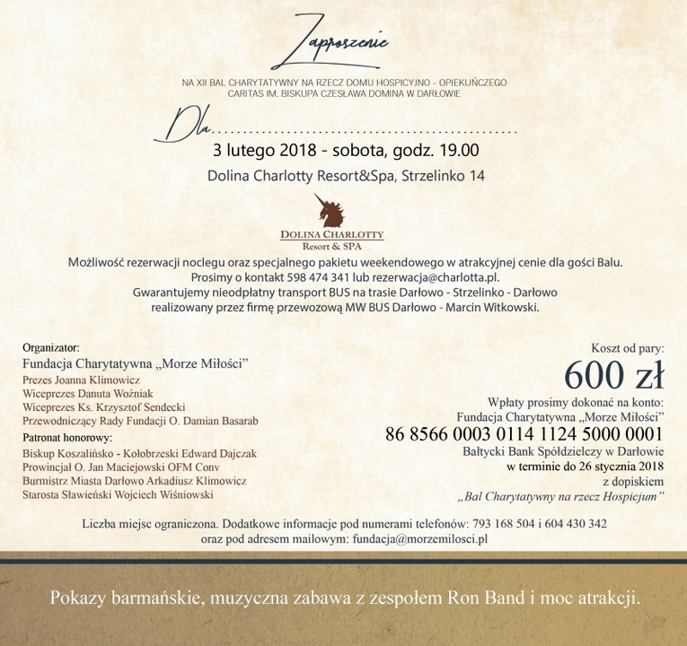 Całkowity dochód z balu przeznaczony jest na potrzeby hospicjum. Liczba miejsc ograniczona. Istnieje możliwość rezerwacji noclegów.