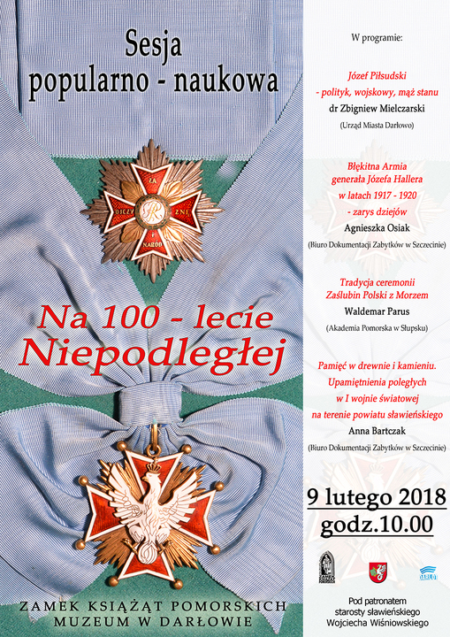 Zamek Książąt Pomorskich - Muzeum w Darłowie zaprasza serdecznie do udziału w sesji popularno-naukowej organizowanej „Na 100-lecie Niepodległej". Odbędzie się ona w najbliższy piątek o godz. 10:00 w siedzibie tutejszego Muzeum - tj. Darłowo - ul. Zamkowa 4. W programie:
