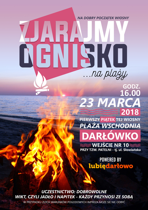 Zapraszamy już jutro - piątek 23 marca 2018 roku, o godz. 16:00 do udziału w społecznym happeningu pn.: Zjarajmy wspólnie ognisko". Gdzie się spotykamy? W Darłówku Wschodnim - na plaży - wejście nr 10 tj. pierwsze wejście na plażę od Patelni. Co powinniście zabrać ze sobą? Swoich bliskich, prowiant, coś ciepłego do picia, jakiś koc i ciepłe ubranie. My zadbamy o drewno i klimat przy ognisku. Wydarzenie jest inauguracją sezonu ogniskowo/grillowego w Darłowie. Mile widziani wszyscy Ci, którym pomysł przypadł do gustu i mają ochotę zrobić to z nami.