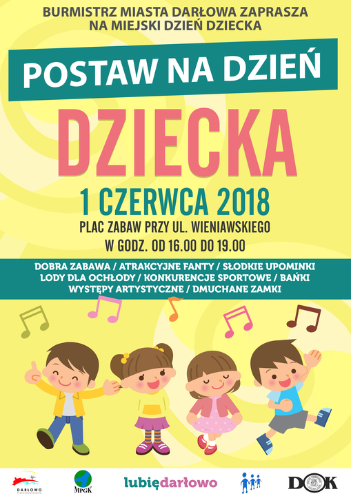 Burmistrz Darłowa Arkadiusz Klimowicz zaprasza wszystkie dzieci na Miejski Dzień Dziecka, który odbędzie się już w piątek - 1 czerwca 2018 roku, na Placu Zabaw przy ul. Wieniawskiego. Impreza odbędzie się w godzinach 16:00 - 19:00. Organizatorzy gwarantują: dobrą zabawę, atrakcyjne fanty, słodkie upominki, lody dla ochłody, konkurencje sportowe, występy artystyczne, bańki mydlane i dmuchane zamki. Zapraszamy.