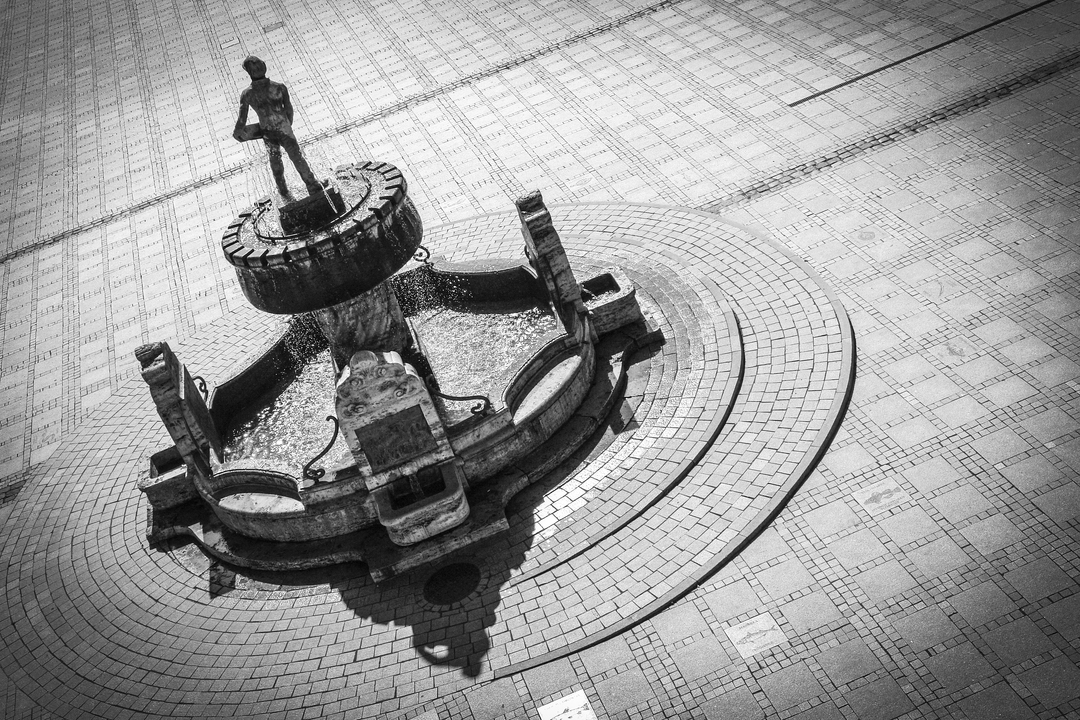Przepiękną fontannę zwieńcza stojąca postać rybaka trzymającego w rękach kadłub łodzi. Na cokole fontanny z trawertynu wmurowano cztery tablice z brązu. Informują one w skrócie o drugiej lokacji miasta i o jego głównych funkcjach handlowych.