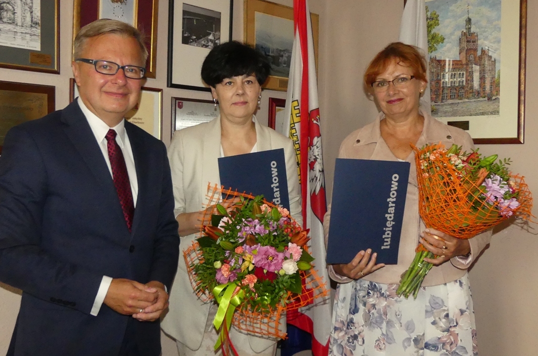 Gospodarz miasta wręczył obu paniom kwiaty i podziękowania za wzorowe pełnienie obowiązków dyrektora Miejskiego Gimnazjum im. Stanisława Dulewicza w okresie w okresie od 1.09.2008 r. do 31.08. 2018 - Małgorzacie Świątkowskiej i dyrektorce Przedszkola Nr 2 im. Janiny Porazińskiej w okresie w okresie od 22.01.2013 do 31.08. 2018 - Grażynie Dulewicz. Do podziękowań Arkadiusz Klimowicz dołączył życzenia zdrowia i szczęścia rodzinnego.