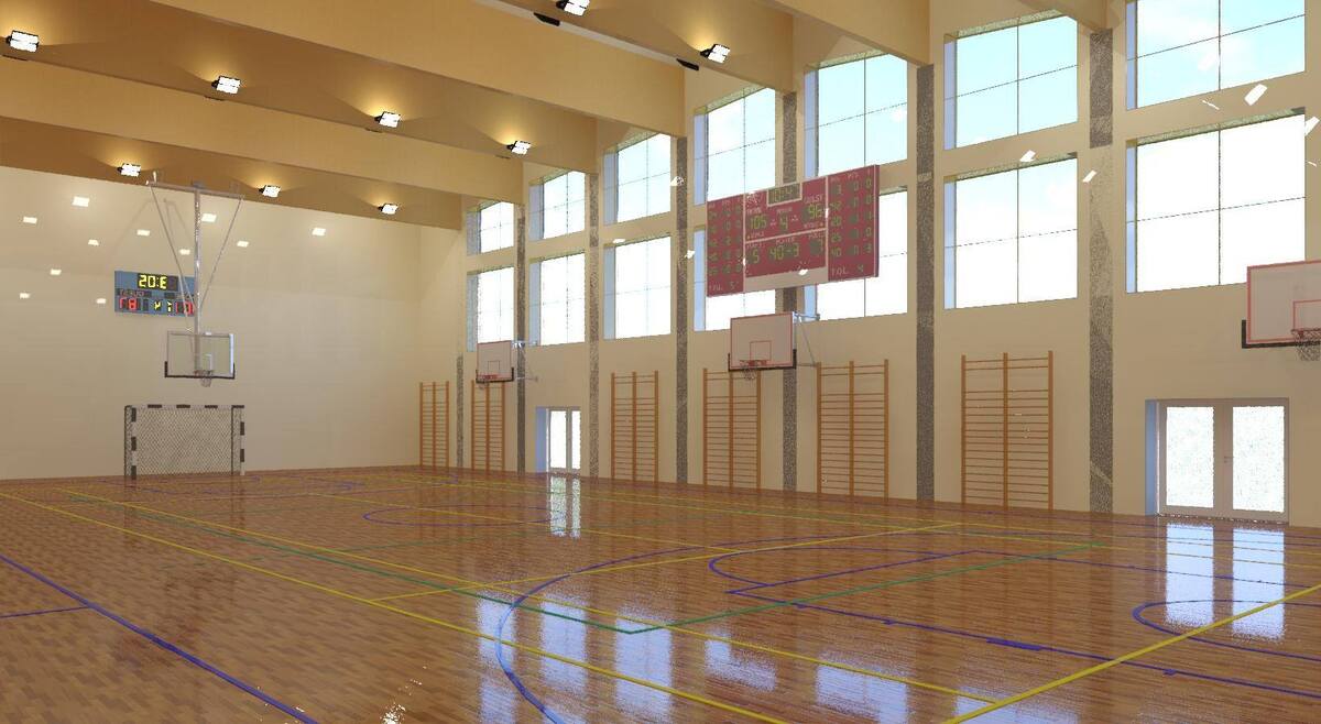 Główna arena sportowa na parterze zajmie powierzchnię 760 m2. Na niej znajdować się będzie boisko do koszykówki o wymiarach 28x15m oraz boisko do gry w siatkówkę (18x9 m). Arena umożliwi również wykorzystanie  swej powierzchni na dwa treningowe boiska do siatkówki umieszczone prostopadle do osi głównego boiska. W celu zwiększenia bezpieczeństwa i komfortu gry zapewniono  po obwodzie głównego boiska do koszykówki wolną przestrzeń o szerokości 1,5 do 2m. Na wysokości 1,5 m od nawierzchni boisk sportowych zaprojektowano stałe i mobilne trybuny. Do obsługi sali  gimnastycznej na parterze zaprojektowane zostało całe zaplecze ogólnodostępnych szatni, recepcji, sanitariatów. Ponadto będzie tam również wielofunkcyjna sala powierzchni - 48 m2 .