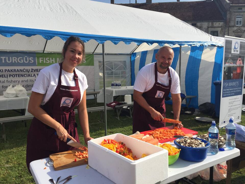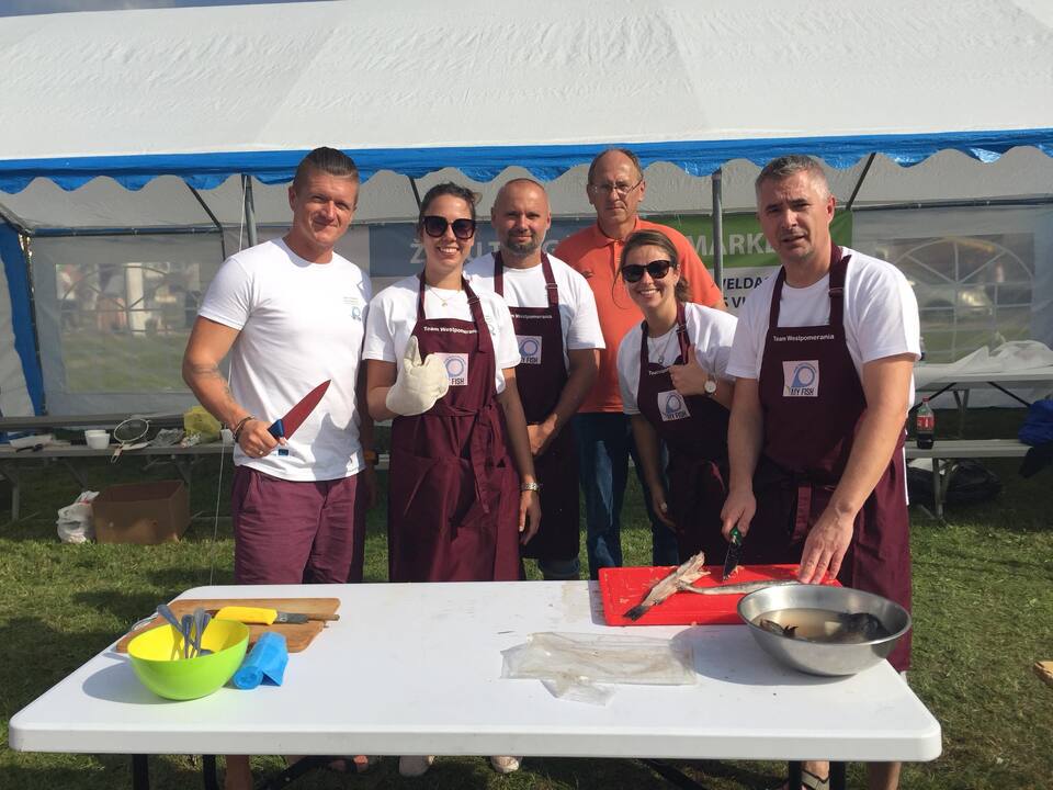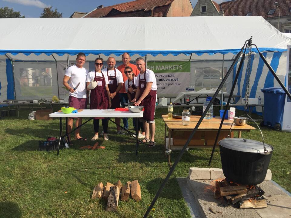 Każdego roku od dziesięciu lat w pierwszy weekend września, w litewskim Silute (Szyłokarczma) odbywa się święto ryby, które już stało się tradycją i rokrocznie przyciąga tysiące widzów. W tym roku do mistrzowskiego konkursu przystąpiło ponad 50 drużyn, wśród których byli zawodowi kucharze, restauratorzy oraz ludowi smakosze z całego świata. Szyłokarczma (Silute) leżąca w pobliżu Zalewu Kurońskiego słynęła z targu rybnego, który odbywał się przez bez mała 500 lat. Dlatego w tym miasteczku w trzecim dniu spotkania roboczego partnerów projektu Fish Markets na zaproszenie gospodarza mera Silute razem z koleżankami z Urzędu Marszałkowskiego - Dominiką i Anią darłowska reprezentacja stanęła przed wyzwaniem ugotowania zupy rybnej wg własnej receptury. Szefem darłowskich kucharzy był Bartłomiej Kruk, na co dzień tworzący zespół referatu integracji europejskiej i inwestycji. Jego prawą ręką był Sławomir Herman - z-ca kierownika ds. inwestycji. Nasze koleżanki odpowiedzialne były za stałą kontrolę procesu gotowania i weryfikowania smaku.