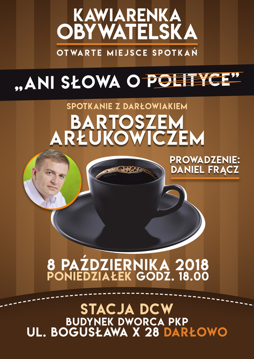 Zapraszamy na październikową Kawiarenkę Obywatelską. Tym razem spotkamy się z pochodzącym z Darłowa - Bartoszem Arłukowiczem. Spotkanie pn.: „ani słowa o polityce" poprowadzi Daniel Frącz. Kiedy? W poniedziałek, 8 października br., o godz. 18:00 w Darłowskim Centrum Wolontariatu - tj. Darłowo, ul. Bogusława X 28. Polecamy uwadze i zapraszamy.