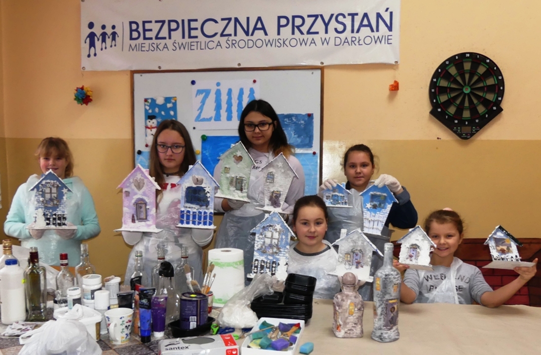 W pierwszym tygodniu ferii od 29 stycznia  2019 na zajęciach metodą  decoupage zbudowano kilkanaście pięknych  zimowych domków i wzięto udział w konkursie plastycznym „Bezpiecznie spędzamy ferie zimowe”. O tym samym tytule, co konkurs plastyczny  miano zajęcia  z funkcjonariuszem darłowskiej Policji. Ponadto brano udział w zajęciach komputerowych i w grach oraz zabawach świetlicowych. W ramach wyjazdów dwukrotnie odwiedzono kino „Bajka” oglądając trzy seanse filmowe: „Zimowe przygody Jilly i Joe”; „Akademię pana Kleksa” i „Tajemnica Księcia Mateusza. Również dwukrotnie wzięliśmy udział  w lepieniu z gliny figurek w pracowni ceramicznej "Zapiecek" należącej do pani Agnieszki Gozdalskiej- mówi jedna z wielce zadowolonych dziewczynek, a chłopiec dodaje ja wyszalałem sie na lodowisku i bardzo smakowała mi fundowana przez świetlicę pizza.