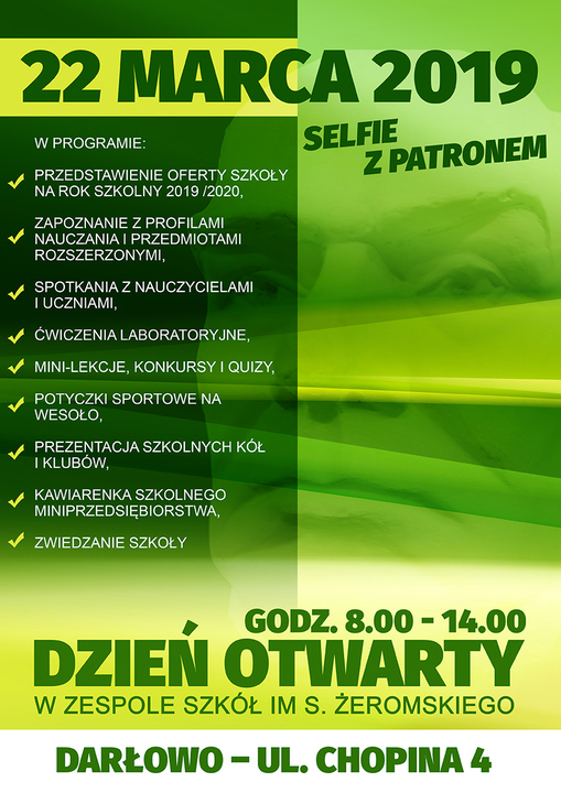 Społeczność Zespołu Szkół im. Stefana Żeromskiego w Darłowie ma przyjemność zaprosić wszystkich zainteresowanych na dzień otwarty szkoły. Odbędzie się on 22 dnia marca 2019 rok, w godzinach 8:00 - 14:00 w Darłowie - siedziba szkoły. ul. Chopina 4.