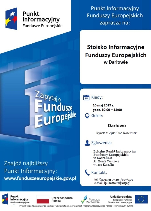 Lokalny Punkt Informacyjny w Koszalinie zaprasza 10 maja na darłowski rynek na indywidualne i bezpłatne konsultacje w zakresie możliwości uzyskania wsparcia ze środków Unii Europejskiej w ramach stoiska informacyjnego otwartych dni funduszy europejskich.