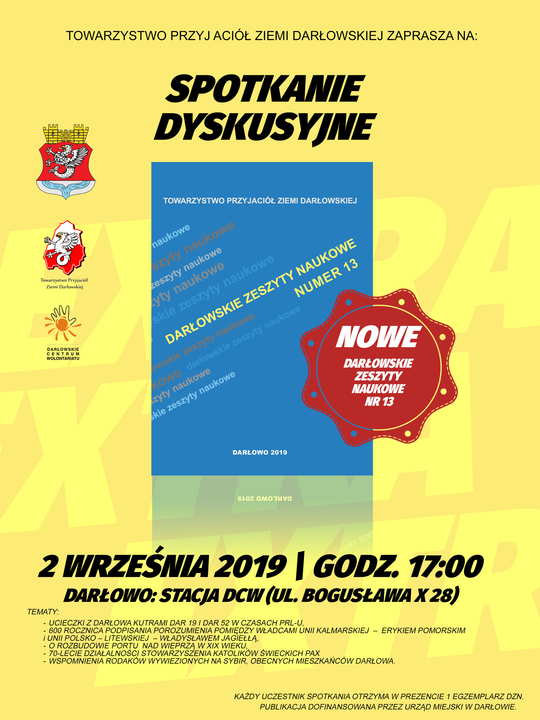 Towarzystwo Przyjaciół Ziemi Darłowskiej zaprasza na otwarte spotkanie dyskusyjne. Odbędzie się ono 2 dnia września 2019 roku, o godz. 17:00 w siedzibie Darłowskiego Centrum Wolontariatu (Darłowo - ul. Bogusława x 28). Każdy uczestnik spotkania otrzyma w prezencie 1 egzemplarz publikacji Darłowskich Zeszytów Naukowych nr 13. Spotkanie otwarte - zapraszamy do dyskusji i polecamy uwadze.