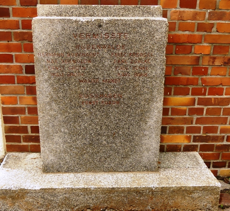 Płyta pochodzi z pomnika wystawionego poległym mieszkańcom Darłowa podczas I wojny światowej. Pomnik upamiętniający żołnierzy poległych w czasie I wojny światowej odsłonięto uroczyście 4 czerwca 1922 r. na wzgórzu Kopa. Wykonano go z granitowych bloków w kształcie tumby spoczywającej na wysokim cokole, na którym w pięciu kolumnach umieszczono nazwiska poległych mieszkańców miasta. Na tumbie znajdował się odlany z brązu relief, przedstawiający młodą niewiastę, przyjmującą z rąk anioła napełnioną czarę. Scena ta była symbolem przerwanego młodego życia ziemskiego i dostąpieniem niebiańskiej szczęśliwości. Po II wojnie światowej pomnik rozebrano, bloki kamienne ustawiono na skraj parku, a płyta z brązu zaginęła. Znaleziony granitowy blok jest jednym z pięciu, na których wyryto nazwiska poległych mieszkańców Darłowa. Po odnowieniu zamontowano go na dziedzińcu zamkowym przy wejściu na wystawę Dirlov- Rügenwalde- Darłowo.