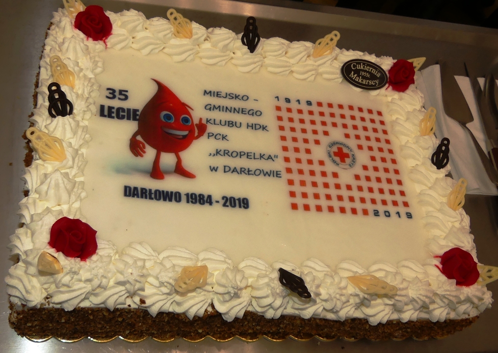 Spotkanie zakończyły wystąpienia przedstawicieli Polskiego Czerwonego Krzyża z Koszalina oraz konsumpcja okazałego tortu, na którym - jak miało być inaczej- oprócz loga Polskiego Czerwonego Krzyża znalazła się tytułowa czerwona piękna Kropelka, duma darłowskich krwiodawców.