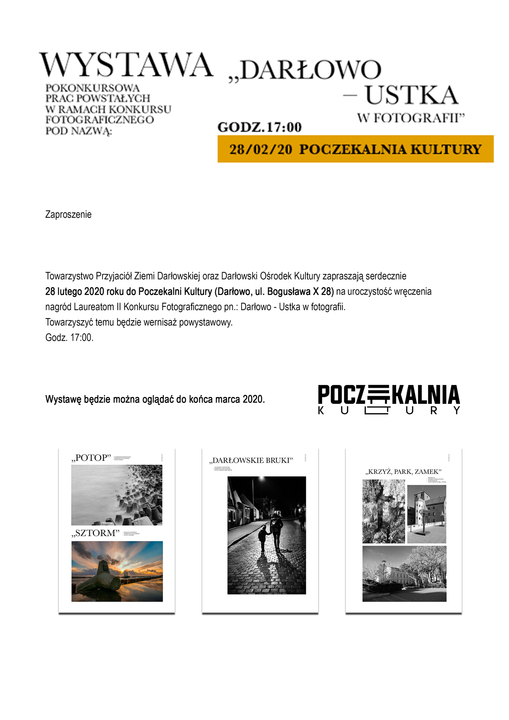 Towarzystwo Przyjaciół Ziemi Darłowskiej oraz Darłowski Ośrodek Kultury zapraszają serdecznie 28 lutego 2020 roku do Poczekalni Kultury (Darłowo, ul. Bogusława X 28) na uroczystość wręczenia nagród Laureatom II Konkursu Fotograficznego pn.: Darłowo i Ustka w fotografii. Towarzyszyć temu będzie wernisaż powystawowy. Godz. 17:00.