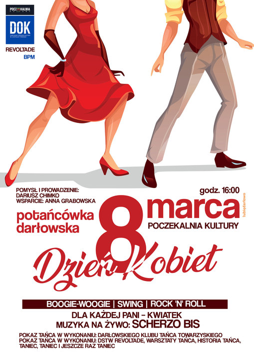 Darłowski Ośrodek Kultury wraz z Poczekalnią Kultury zaprasza do udziału w Potańcówce Darłowskiej. Potańcówka Darłowska to cykliczna impreza taneczna mająca na celu przybliżyć Odbiorcom różne rodzaje tańca a także zaznajomić ich z ich historią. I tak w styczniu, na Zamku w Darłowie odbył się wieczór z Tangiem Argentyńskim. Tym razem zapraszamy na boogie-woogie, swing i rock'n'roll.